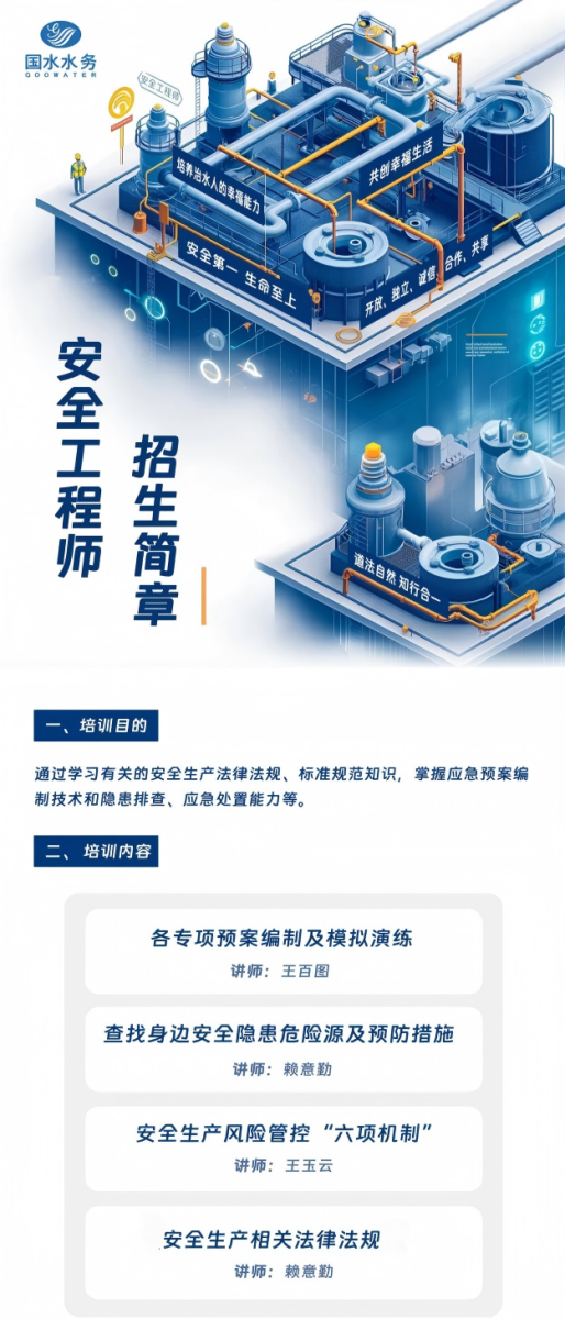 “安全是底線,人才是防線。”近日,國水水務(wù)“安全工程師崗位培訓(xùn)+內(nèi)部安全攻堅活動”雙軌行動正式啟動。這不僅是公司深化“學(xué)安全、強(qiáng)技能、固防線”內(nèi)部建設(shè)的關(guān)鍵舉措,更標(biāo)志著國水水務(wù)將“自我安全賦能” 的實戰(zhàn)經(jīng)驗,轉(zhuǎn)化為面向涉水企事業(yè)單位的 “安全人才培育+安全體系搭建” 培訓(xùn)產(chǎn)品正式成型?—— 既實現(xiàn)自身安全人才專業(yè)化、內(nèi)部安全管理標(biāo)準(zhǔn)化,更能為客戶提供 “可復(fù)制、可落地” 的安全培訓(xùn)和安全生產(chǎn)服務(wù),真正做到“先筑牢自家籬笆,再為客戶遮風(fēng)擋雨”。